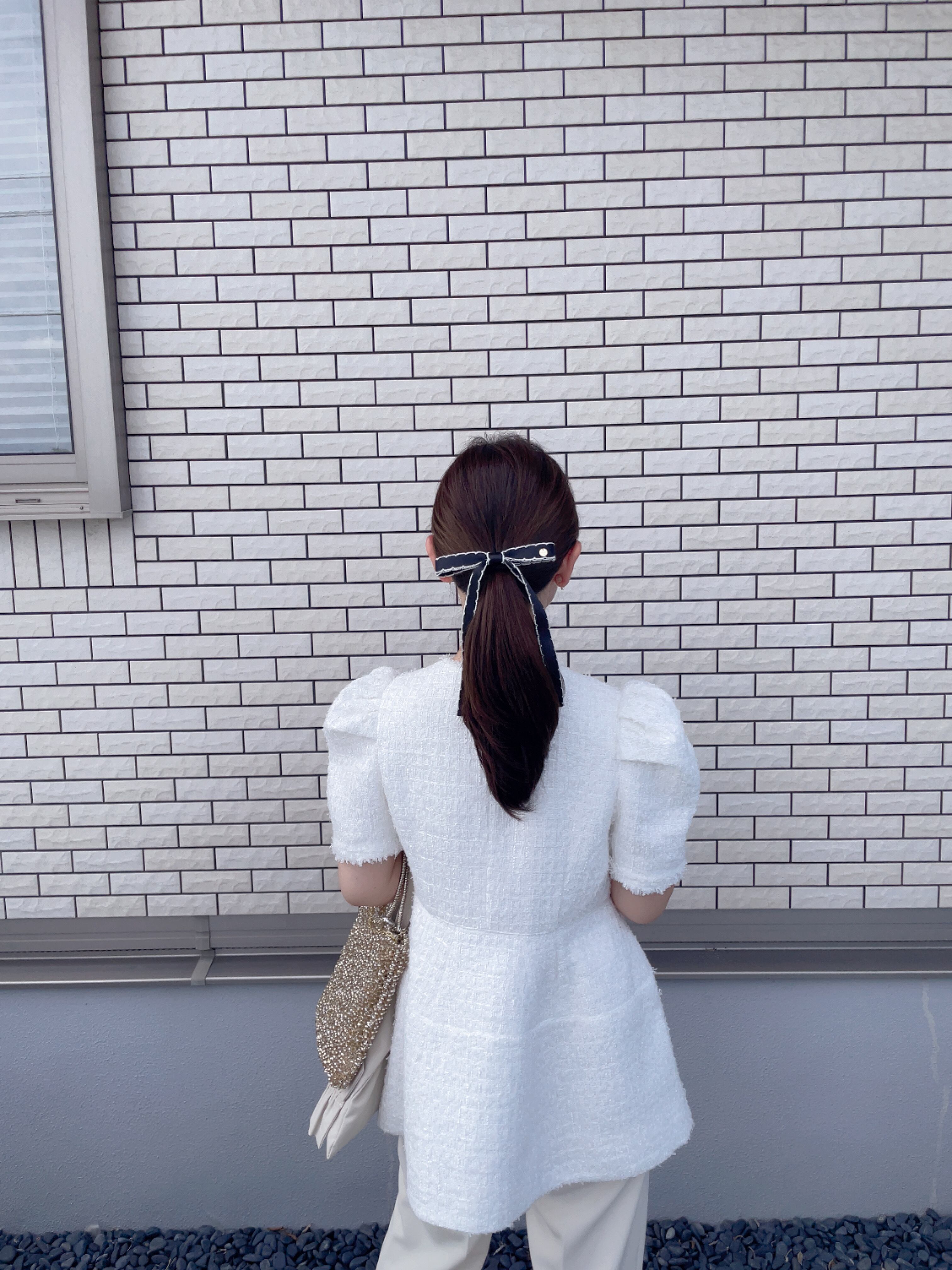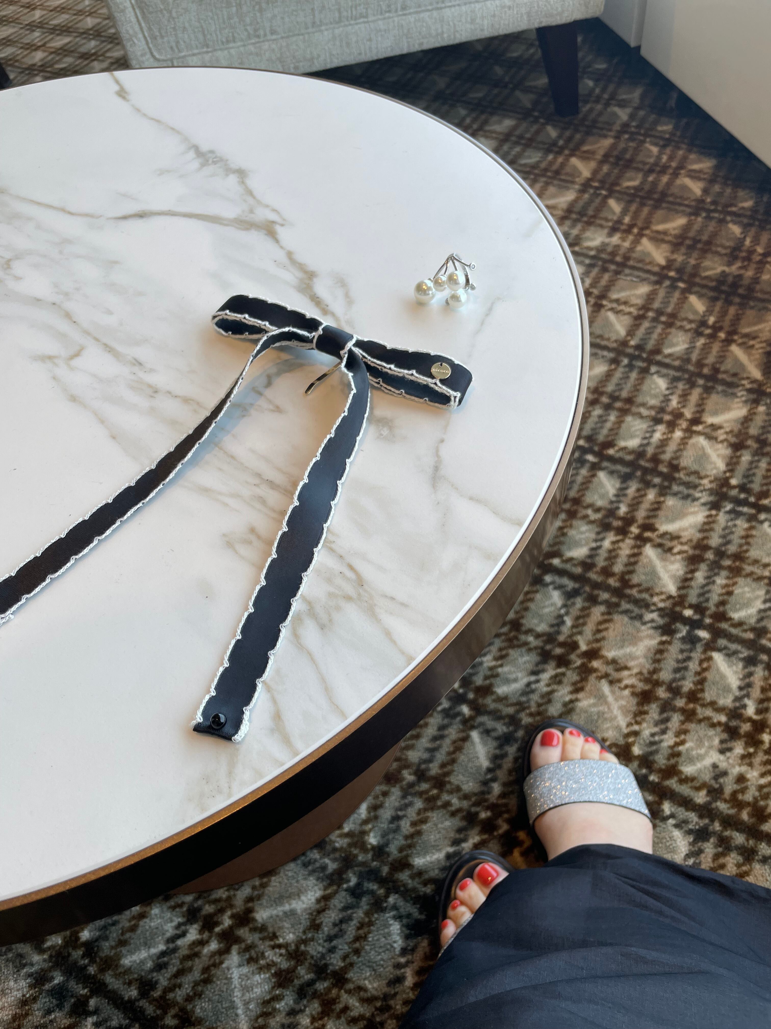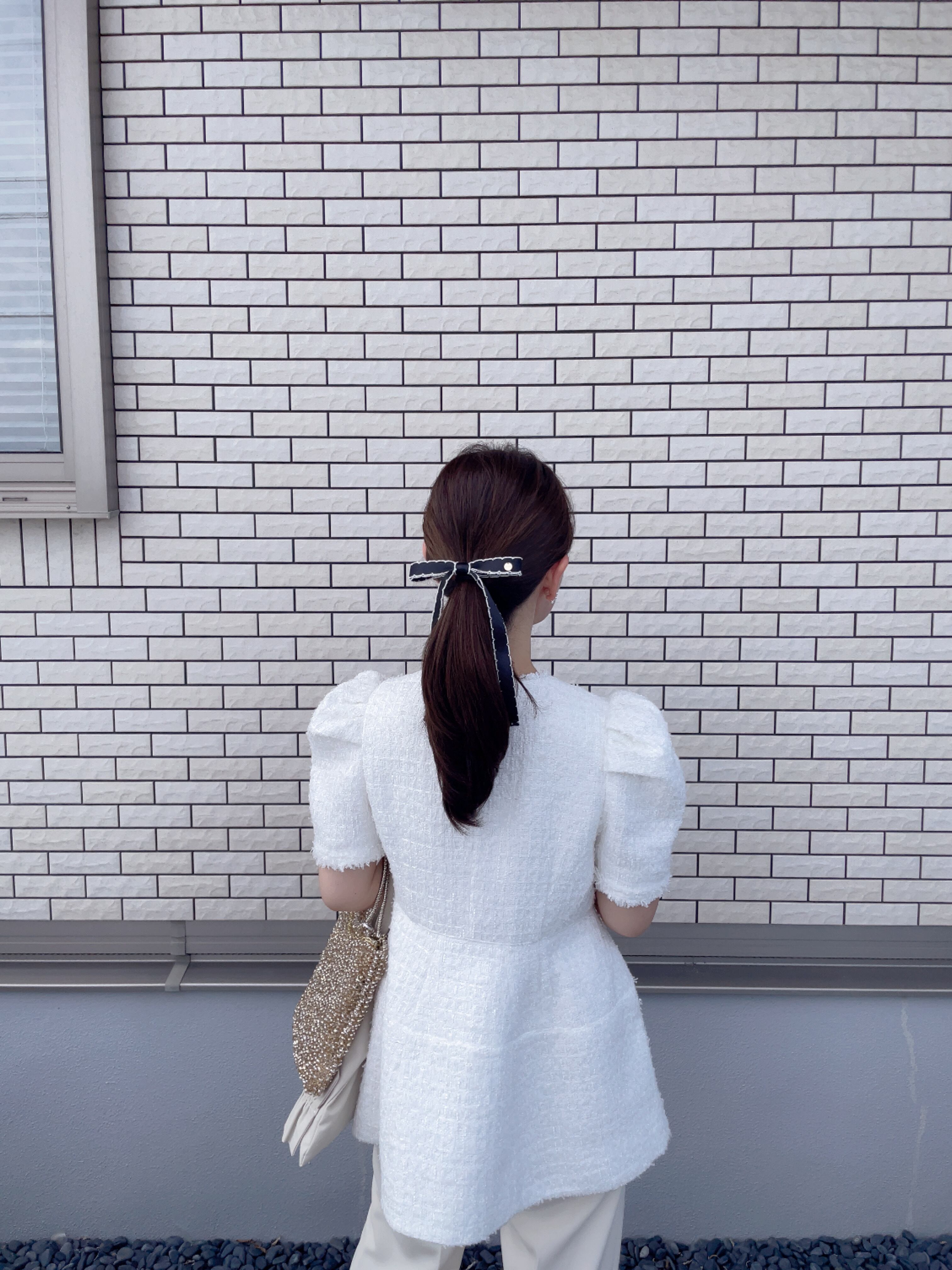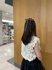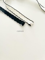 垂れ下がった先にはリボンに合わせたパールをあしらっております。